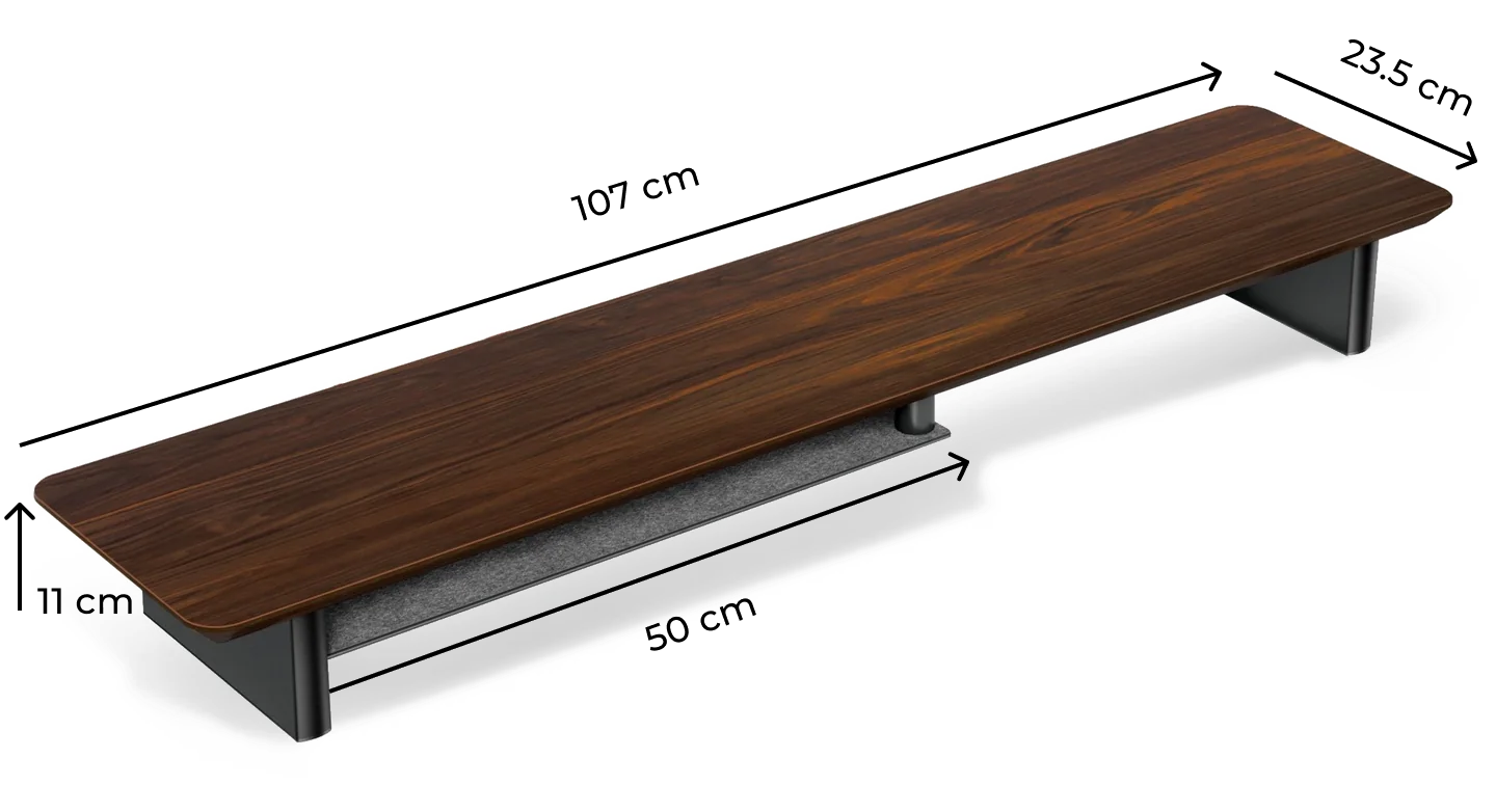 Avec sa largeur généreuse de 107 cm, il accueille facilement deux écrans jusqu’à 27” ou un écran ultra-large jusqu’à 49”. L’espace ouvert en dessous est parfait pour ranger votre clavier et votre souris, gardant votre bureau propre et bien organisé. Sa construction solide et durable supporte jusqu’à 30 kg, idéal pour des écrans lourds ou plusieurs appareils. La finition noyer luxueuse apporte une touche chaleureuse et élégante à votre espace de travail, rendant le travail non seulement plus confortable mais aussi plus stylé.